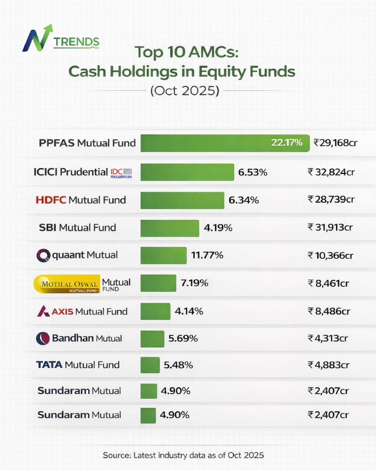 The infographic highlights the Top 10 Asset Management Companies (AMCs) with the highest cash holdings in equity funds as of October 2025, showing both the percentage of cash and the absolute cash value in rupees.